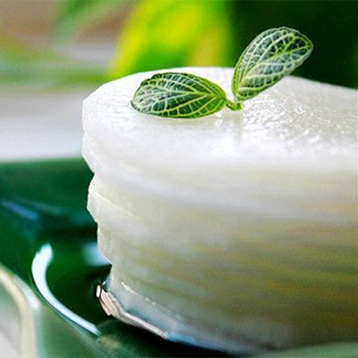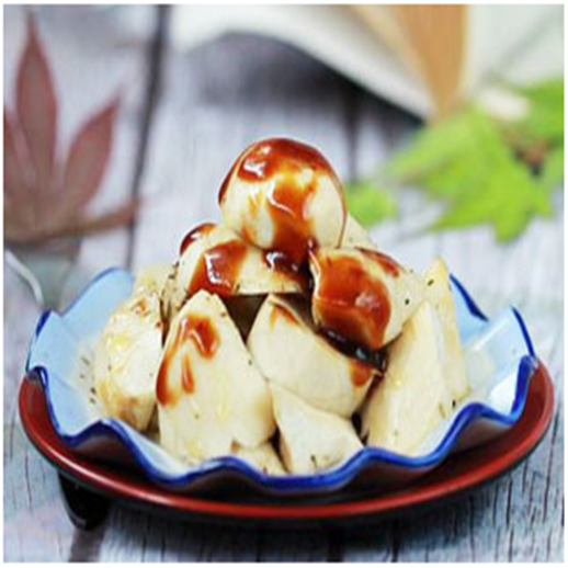 1.Wash Pleurotus eryngii, carve out checkered shape, cut into pieces, putinto ovenware, and bake for 4 minutes with 180 degrees.
